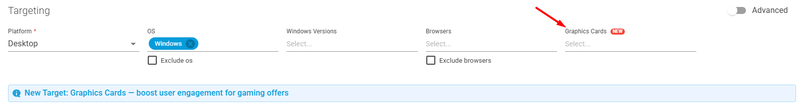 Now, you can maximize user engagement with Graphics Card Targeting — a brand-new feature that allows you to target specific users based on their GPU models. Higher ROI, smarter budgeting, and boosted conversions within a few easy clicks.