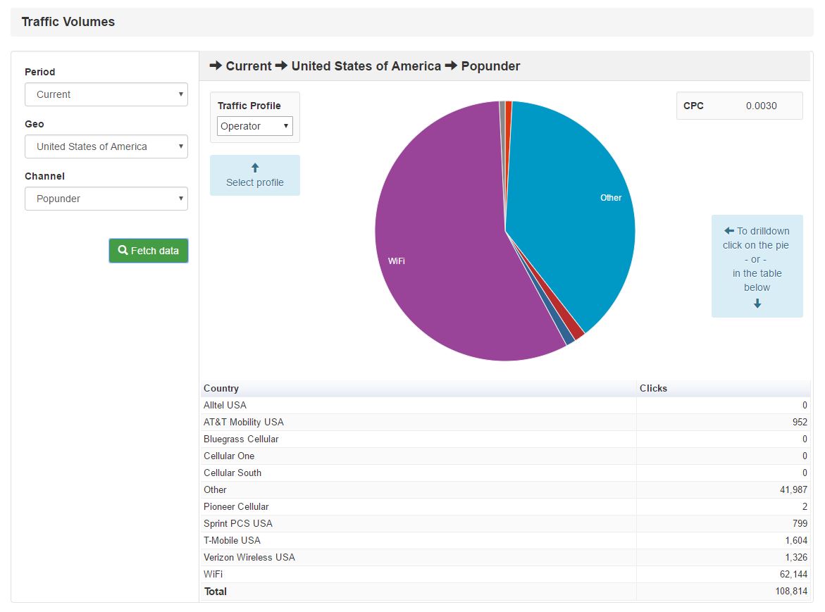 Оценщик трафика даст вам возможность проверить доступный трафик за последние 7 дней или “current” – за последний день. Вы можете начать получать трафик из нескольких уровней внутри ГЕО: оператора, ОС, браузера и устройства.
