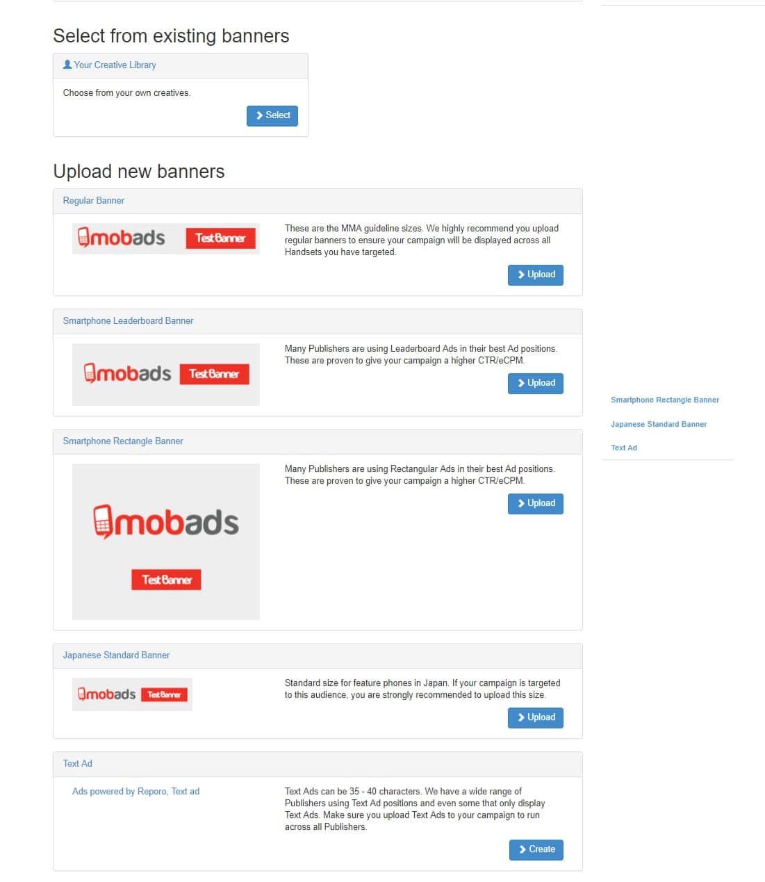 Когда вы добавляете баннеры в вашу кампанию, вы можете выбрать изображения, которые вы загрузили ранее (и которые прошли апрув) в “Manage Creatives”, загрузить новые изображения, которые отправятся к администрации на проверку или создать текстовое объявление.
