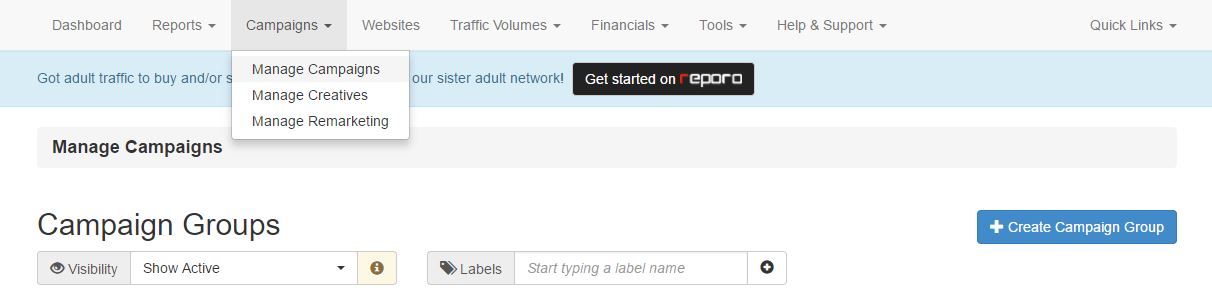 Вы можете проверить Reports (отчеты), Campaigns (кампании), Websites (вебсайты) ,и если вы хотите работать с ними в качестве паблишера, и Traffic Estimator (оценщик трафика).