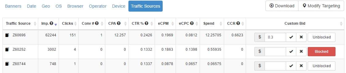 Более того, в таблице источников трафика вы сможете установить определенный бид для каждого источника и исключить источники, с которыми вы не хотите больше работать.